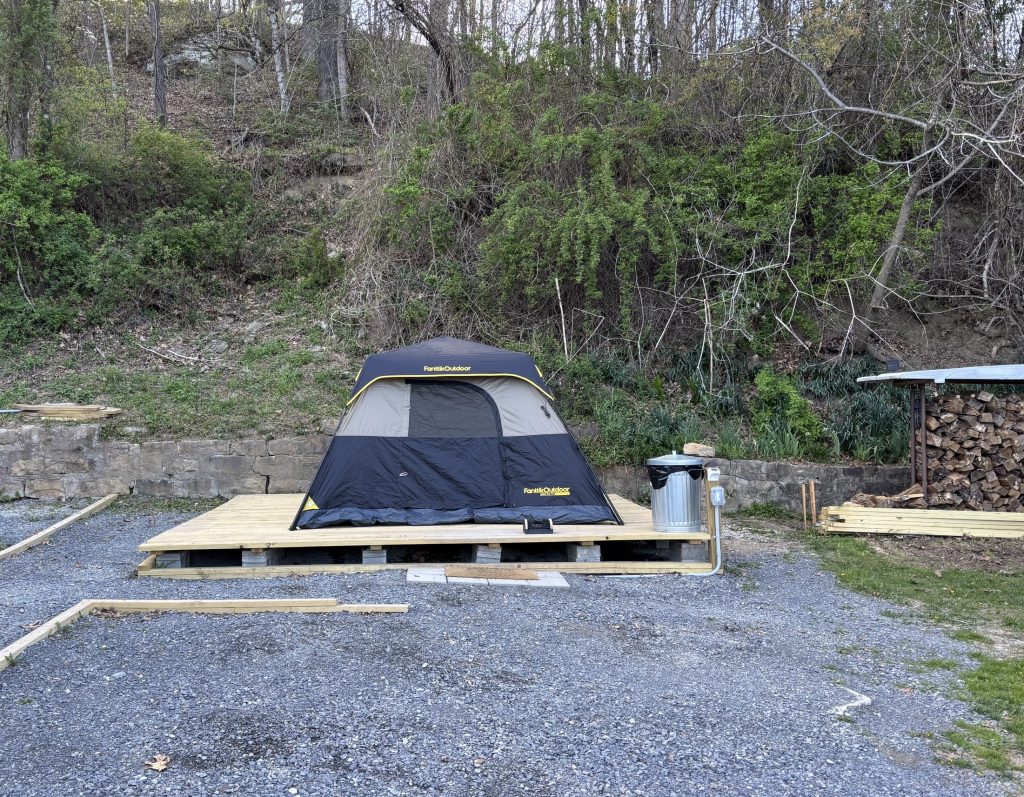 Hilltop Sunrise – Sunrise tent platform with 110 volt AC electricity, pet walk station,